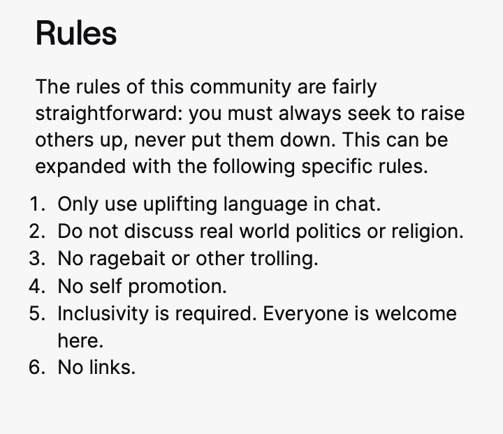 Inclusivity means more than banning certain language—it is actively fostering an environment where people feel safe. Although we are online, we still want to be true to ourselves, and autistic people know full well how dangerous masking is—we won’t allow people to push masking on others. I am always on the lookout for better ways to highlight inclusivity in my rules, so the wording changes, but the idea never does.